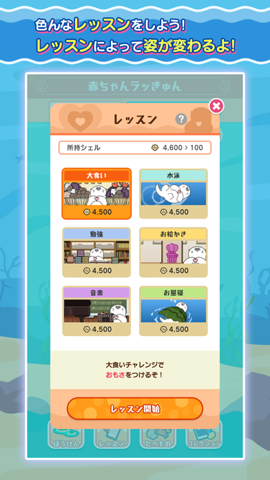 レッスンを受けると進化ゲージが多くためられます。レッスンは6種類あり、こなした進化の種類によってラッきゅんの進化後の姿が変化します。自分が育てたラッきゅんはどんな姿になるのか楽しみです。