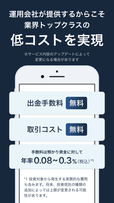 銘柄の選択も入金も、全部おまかせで行ってくれる資産運用サービスです。NISAに対応している点は類似サービスと比較した場合の特長。NISAによる非課税の恩恵を受けつつ、資産を増やす可能性を広げられる点は大きな魅力と言っていいでしょう。2段階の自動リバランスなど、運用面の機能もそろっています。