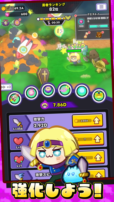 小さな勇者がモンスターと一緒に、勇者を倒していく放置ゲーム! 勇者ランキングで自分が最下位だと知った主人公は、1位になるため自分より上位の勇者を倒す計画を立てます。