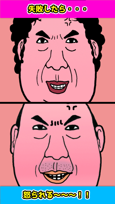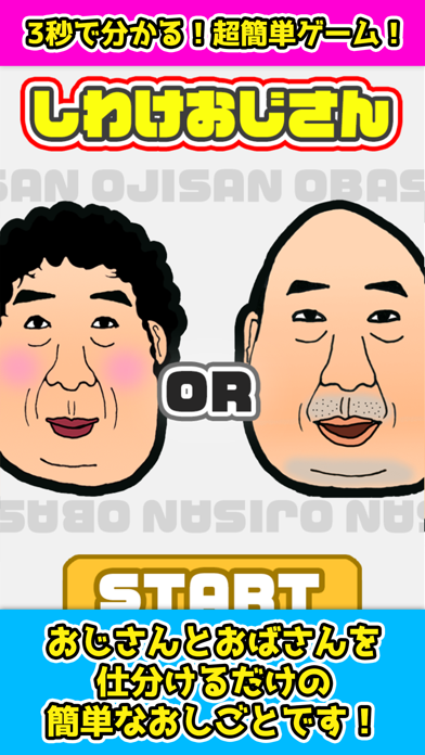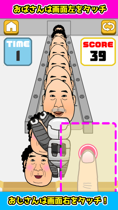 画面の左右をタップしておじさんとおばさんを仕分けます。間違えると画面いっぱいにおじさん、おばさんが出てきて「どうなってんのよー!」と怒られます。仕分けている間もずっと「おじさんおじさん」「おばさん」と流れる音声がシュールです。