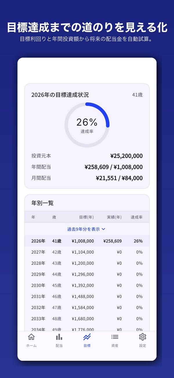 年間の目標利回りや投資額を設定すると、実際の配当金との差を確認できます。目標への道のりを明確になるため、資産運用の戦略を立てるときに便利。また自分の年齢と同時に表示されるので、人生設計の参考にもしやすいでしょう。