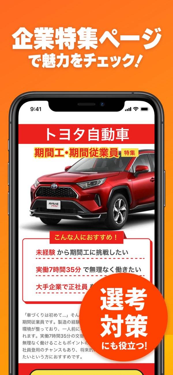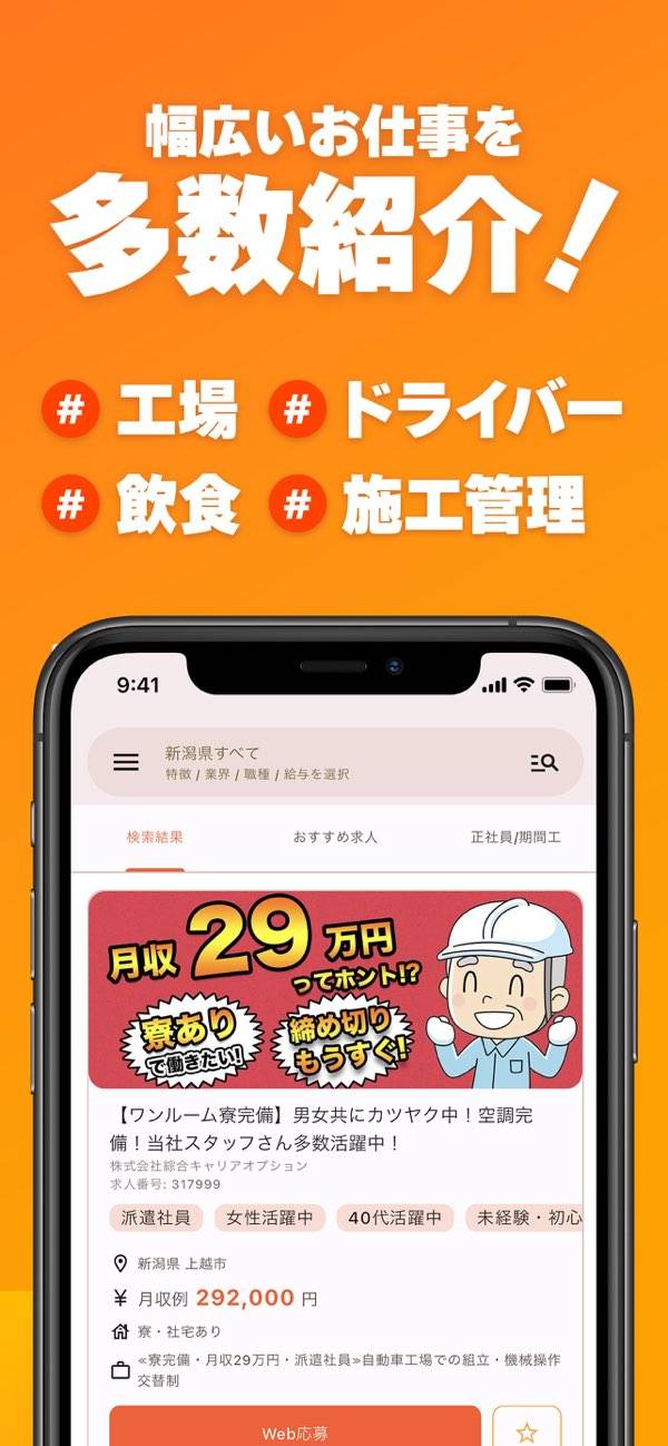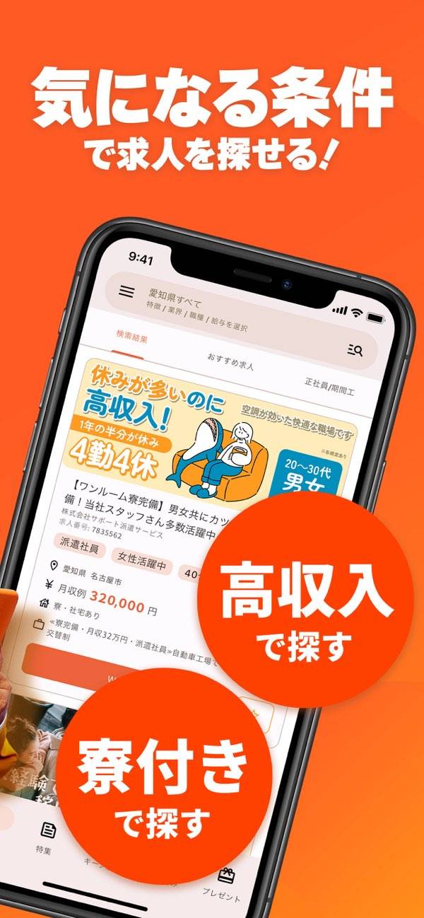 工場などの製造現場の求人が充実している仕事探しアプリ。住居付きや髪型自由といった希望に合った仕事を迅速に探せるのが特徴です。直接企業とメッセージ交換ができるので、不明点を即解消できます。大手メーカーの求人も掲載されており、希望の企業が見つかるかもしれません。