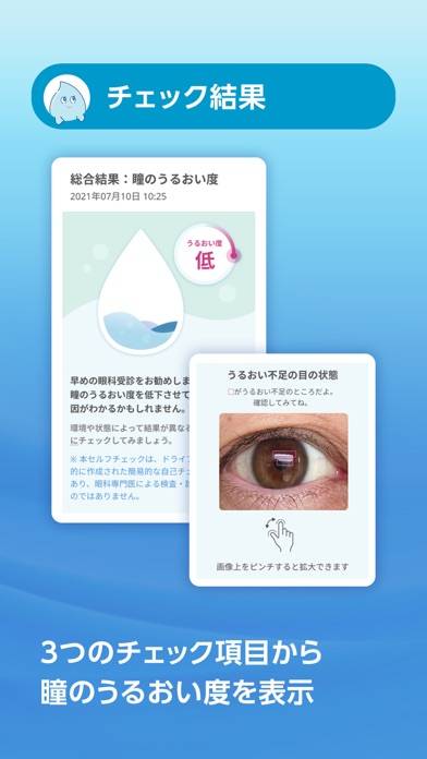 自分の瞳がちゃんとうるおっているか、カメラでチェックできるアプリ。ガイドに従ってスマホのカメラで自分の瞳を撮影すると、うるおいが足りているかどうか診断してくれます。
