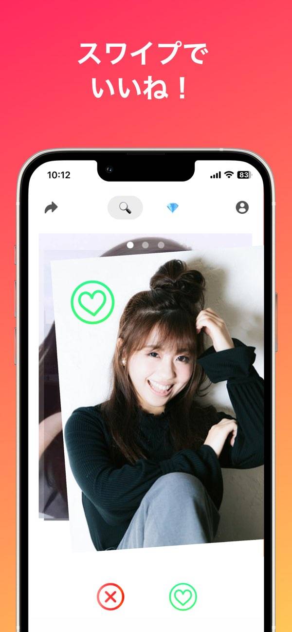 本アプリのユーザー同士が、3枚のプロフィール写真を見て「いいね!」か「×」を選択していきます。お互いに「いいね!」が成立すればIDの交換へ。