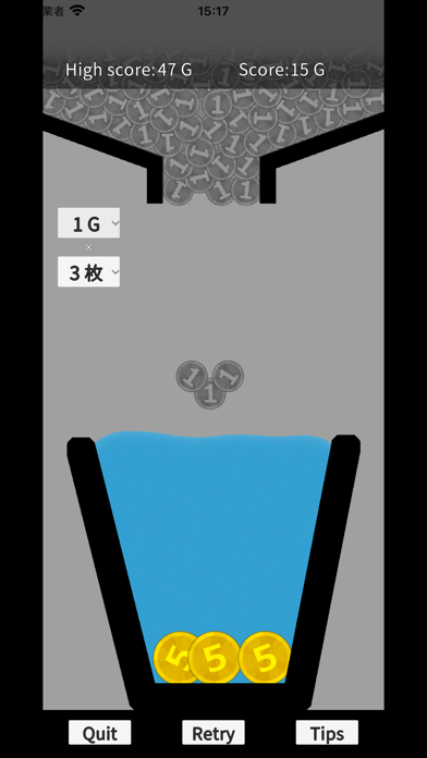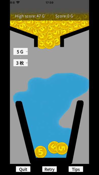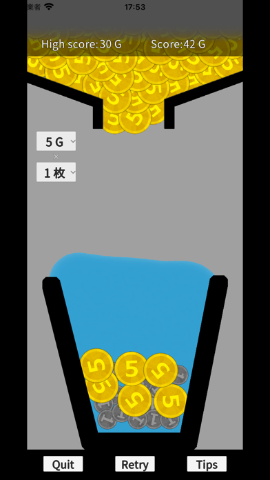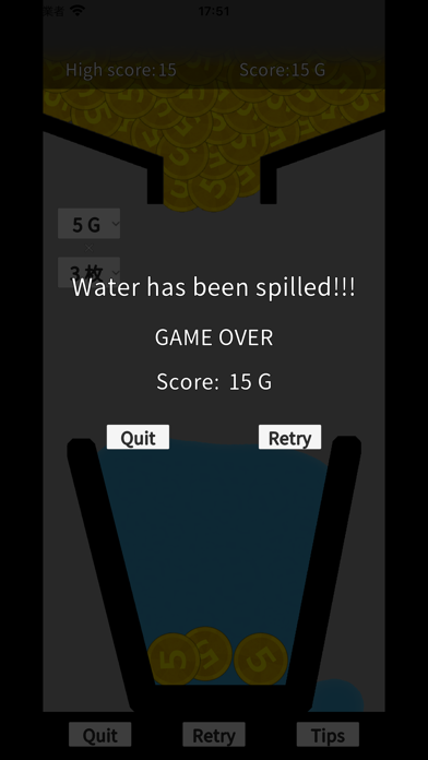 水が張ってあるグラスに、コインを入れていくシンプルなゲーム。5G、1Gのコインを1~3枚ずつ、水があふれないようにどれだけ入れられるか慎重にプレイしてみてください。少しでもあふれるとゲームオーバーです。