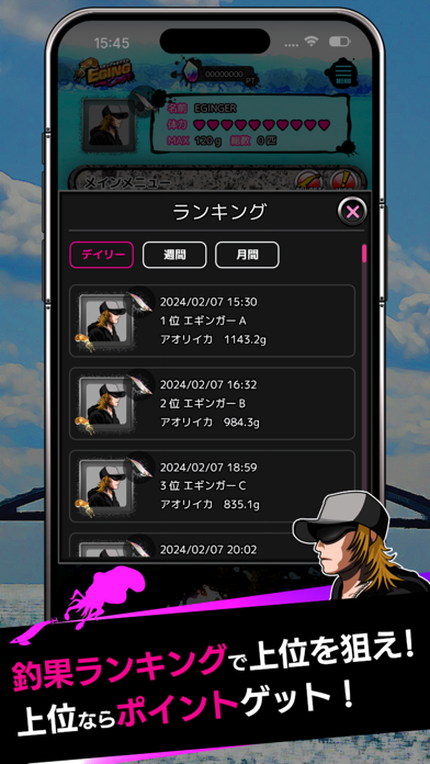 本作では釣ったイカの大きさをほかのプレイヤーと競い合います。毎日のランキングの上位者にはPTが付与されるご褒美付き。PTはショップで新たなエギと交換できます。