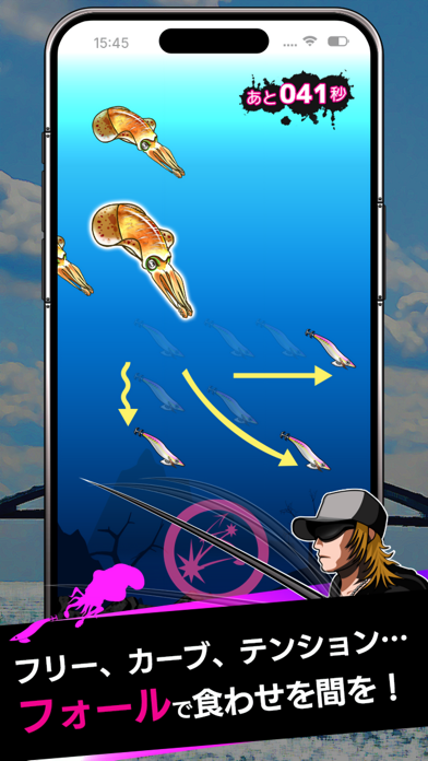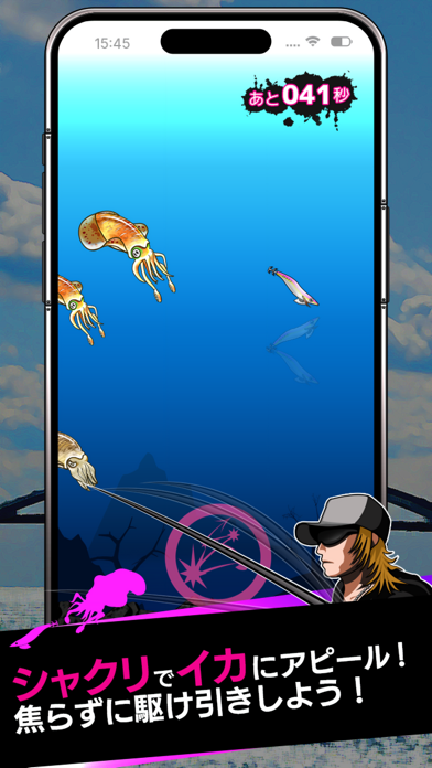 エギング(イカ釣り)がテーマのカジュアルな釣りゲーム。ロッドのキャスト、シャクリでイカを誘う、イカが食い付いたらリールを巻くという一連の動作が再現されています。