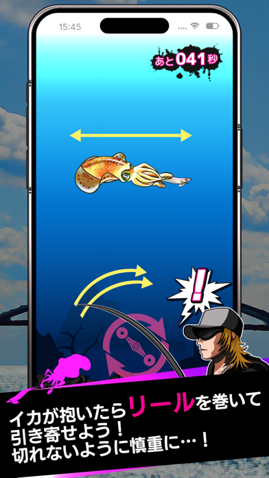 もちろん、イカが食い付いてからも勝負は続きます。画面内を回転させるようにスワイプしてリールを巻きましょう。ですがあまり速く巻きすぎるイカが逃げてせっかくの努力が文字通り水泡に帰してしまいます。はやる気持ちを抑えながらリールを巻くのです。