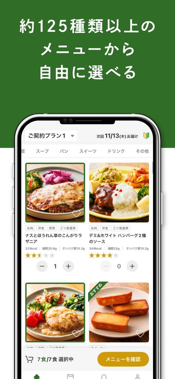 - 7食~21食。1週間~3週間に一度。生活習慣に合わせて選べるコース
