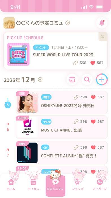 コミュニティ内のユーザーが提供した、推し関連の情報をチェックできます。それらの情報は、ワンボタンで「マイカレ(マイカレンダー)」にリンク可能。推しの大事なイベント情報をキャッチしつつ、忘れないようにしっかりキープしておけます。