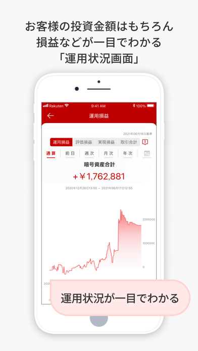 保有している暗号資産をひと目で確認できる楽天のウォレットアプリ。含み益や損失などの運用状況もグラフでわかりやすく表示してくれます。またセキュリティも万全で、ログインや資産の出し入れ時は、2段階認証が必要。そのため、安心してを利用可能。