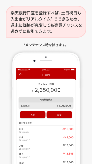 楽天銀行口座からなら、土日祝日もウォレットへ入出金が可能です。暗号資産は土日祝日も取引が可能なため、価格の急変動が起きても対応できます。また、手持ちの資産を本アプリに移したり、逆にほかウォレットへ送ったりも自由自在。