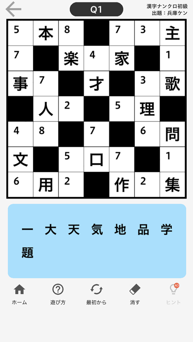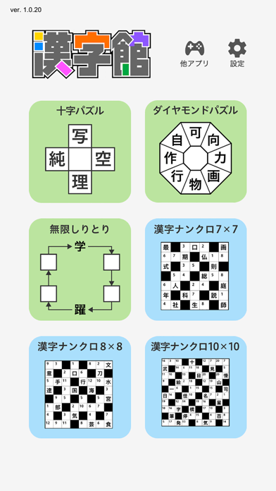 漢字がテーマのパズルゲームが、本アプリだけで8種類も遊べます。オーソドックスな穴埋め問題のほか、無限しりとりやナンクロなどバリーエーションも豊富。