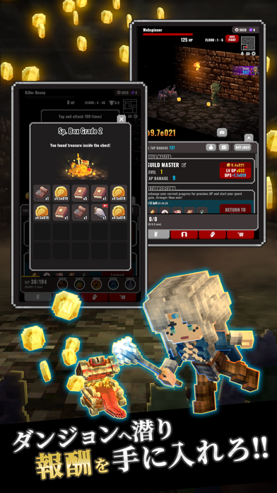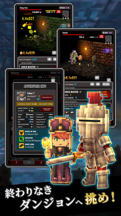 毎日手軽に遊べるクリッカー系RPGのシステムが、本作の根幹となっています。冒険者たちは自動で攻撃するほか、画面連打で自発的な攻撃も可能。敵を倒して集めたゴールドで、冒険者もギルドマスター自身もどんどん強くなっていきます。