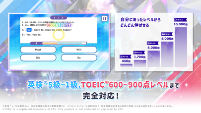 英語学習は英検5級~1級、TOEIC600点~900点までカバー。リズムゲームとしても、英語学習としても納得のクオリティです。