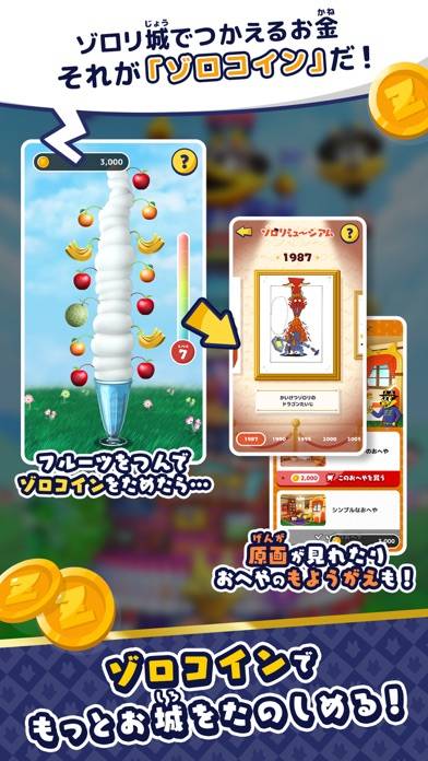 ゲームを通じて入手したゾロコインを使用し、各種コンテンツを解放できます。かつて放映されたアニメが視聴できるゾロリシアターや、制作秘話などが閲覧できるゾロリミュージアムなどが展開され、ファン垂涎モノとなっています。