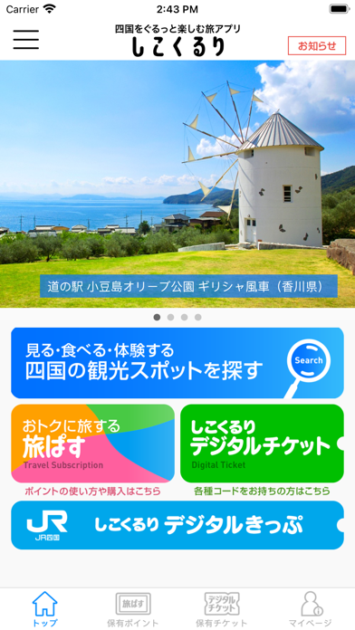 四国に観光・周遊する機会があれば、事前にチェックしておきたいアプリです。幅広い観光情報が掲載されているのはもちろん、四国内の各種施設をお得に利用できる〈旅ぱす〉と、公共交通機関で利用できる〈デジタルチケット〉が利用できる点も見逃せません。