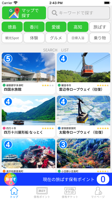 2,500円で6pt(1ptあたり約416円)を購入可能。例を挙げると、四国水族館は通常価格2,400円に対し、5pt(約2080円)で入場可能になります。