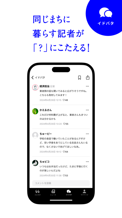 気になったニュースがあれば「イドバタ」機能で、ほかユーザーたちと語り合うことも可能。同じ地域に住んでいる人たちの声を聞くことで、知見も深まるでしょう。