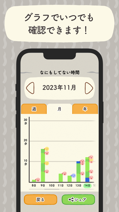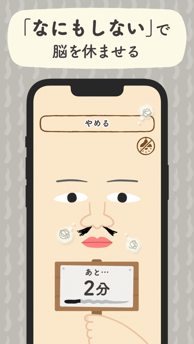 「なにもしない」ことを頑張るエンタメンタルアプリです。画面に表示されるのはなんとも得も言われぬ表情をした謎の顔。彼(?)といっしょに、「なにもしない」を目標に頑張ってみましょう。見事に目標時間を達成したら、ご褒美の鼻毛抜きタイムへ!