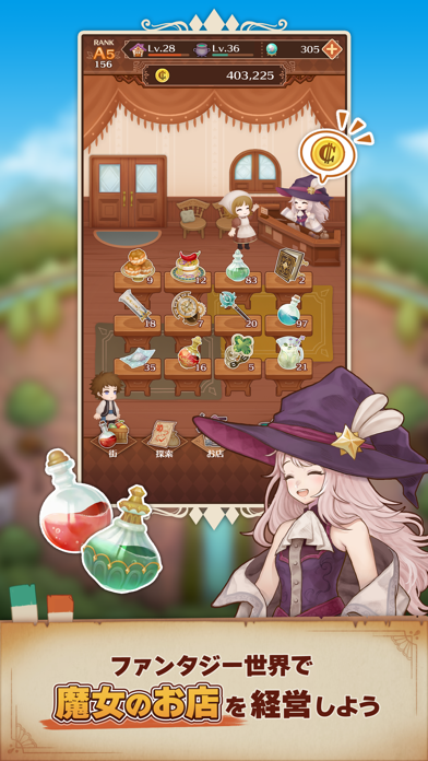 ファンタジー世界でお店を経営するシミュレーションゲームです。魔女の主人公がお店の経営をしながら、少しずつ成長していくサクセスストーリーが描かれます。お店の内装はデコレーションでき、100種類以上の家具から自由にカスタマイズが可能です。