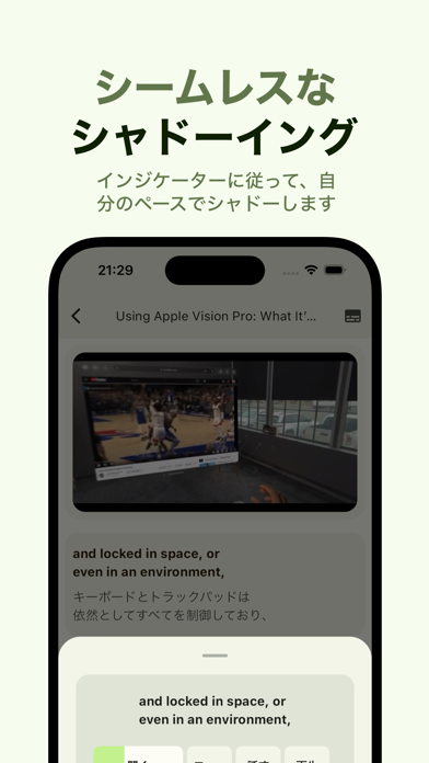 もちろんシャドーイングを補助してくれる機能も。本アプリでは「聞いて」、「話す」の間に一度「頭の中で理解する」(エコー)が挟まるエコー練習法が取り入れられています。