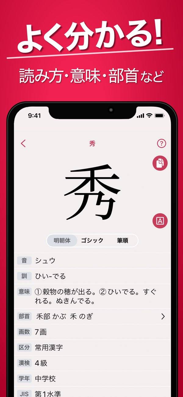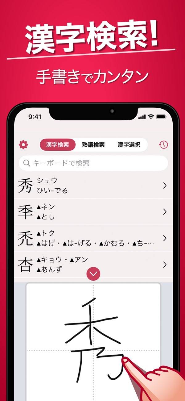 読めない漢字を知りたいときは本アプリの出番。手書きで使える漢字辞典です。画面上に表示されたパッドに見様見真似で漢字を書き写せばOK。ある程度字体が崩れていても、アプリが候補を表示してくれます。