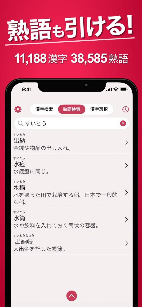 身近な言葉から四字熟語まで、熟語も本アプリで調べられます。特に漢字検定ではあまり聞き慣れない四字熟語が出題されることも多々あり。意味を理解すればより習得しやすくなるかもしれませんね。また熟語内の各漢字ごとの意味もいっしょに確認できます。