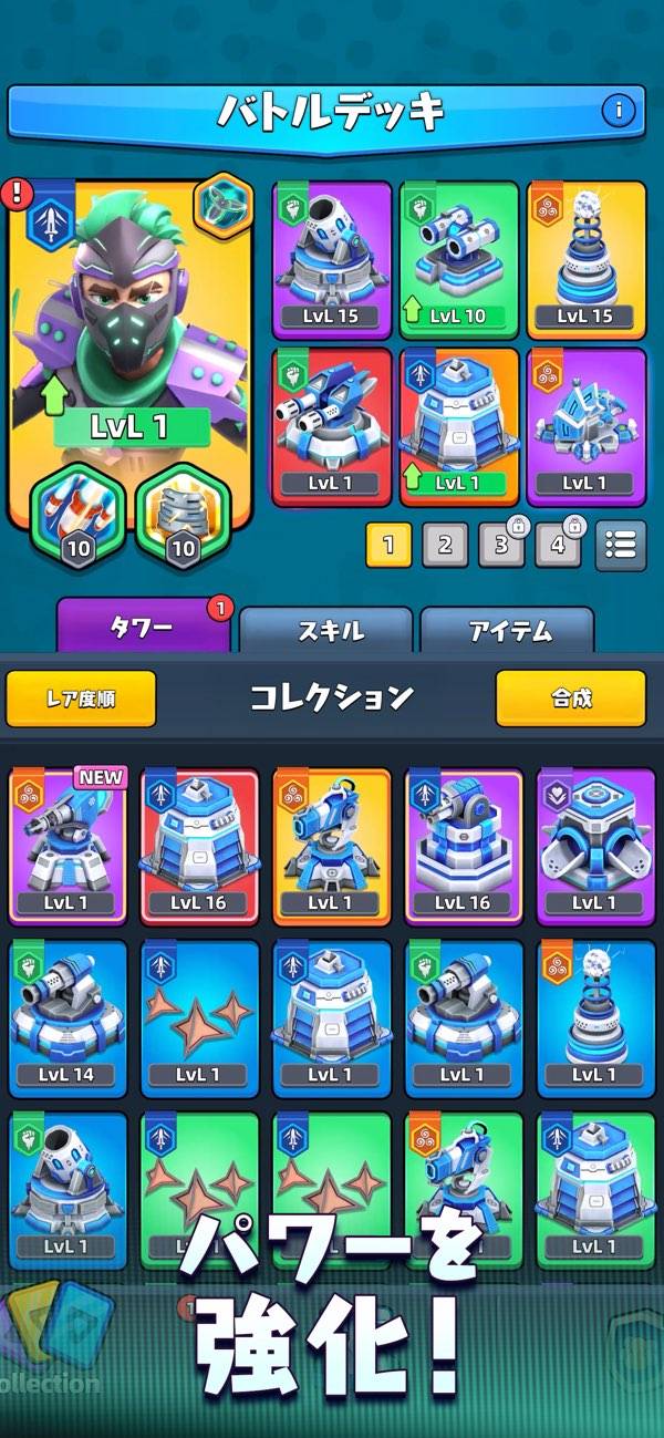 バトル中に使うタワーやスキルは事前にデッキとして設定しておきます。またプレイ中に新たなタワーを獲得することも。ボウリング、花火、インフェルノなど、名前からして個性的なタワーが使用可能になっていきます。