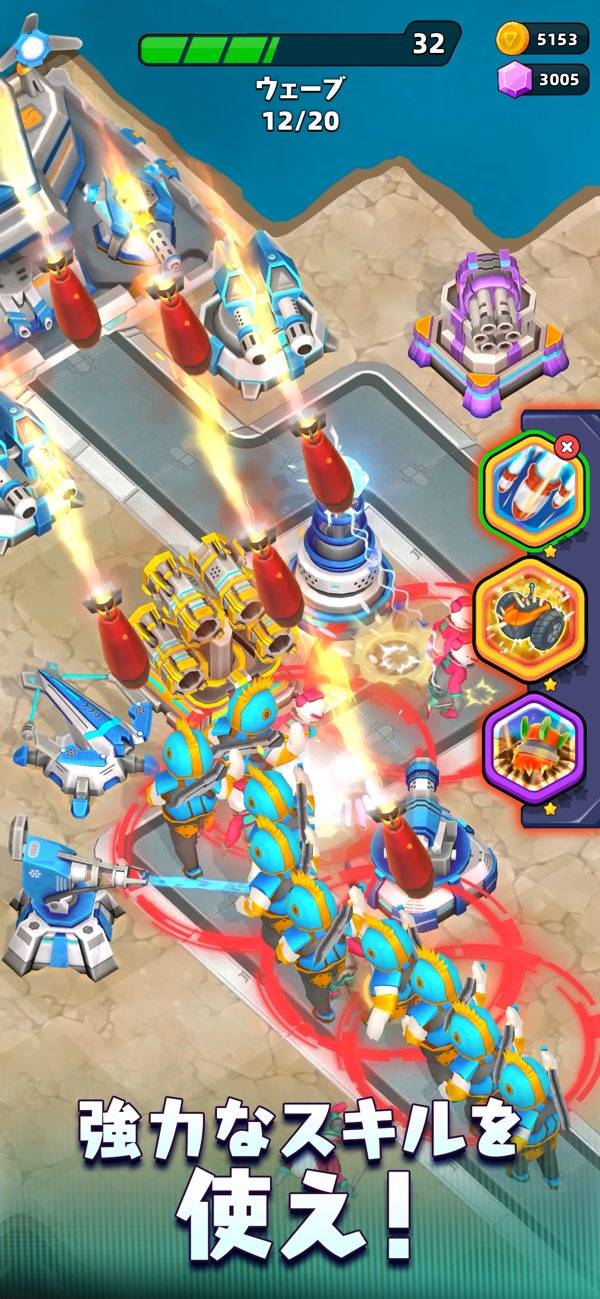システム的にはオーソドックスなタワーディフェンスとなっています。ステージ中に設置したタワーが自動で敵を攻撃するほか、任意のタイミングで発動できるスキルの要素もあり。スキルには30秒のクールタイムがあるため、使い所の見極めが肝心です。