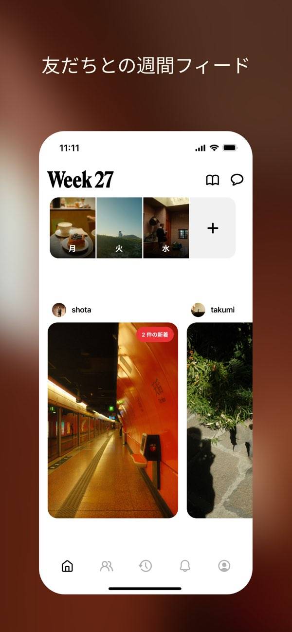 ホーム画面上部には自分が投稿した写真が、映画のフィルムのような形で並んでいきます。画面下部は友達の投稿も含めたいわゆるフィード。