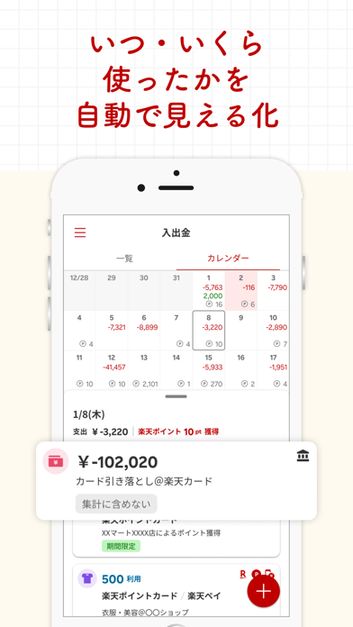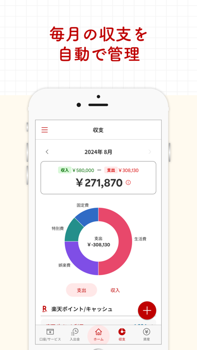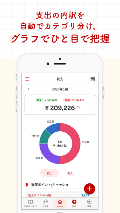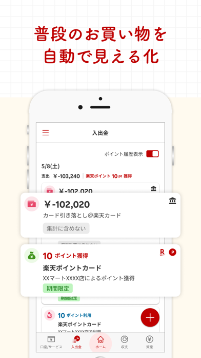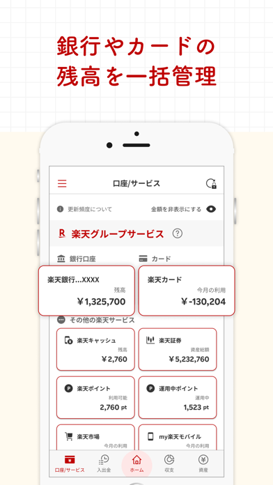 「楽天カードの利用履歴」「楽天銀行の入出金」「楽天ポイントの獲得状況」など、楽天の金融サービスを一元管理できます。