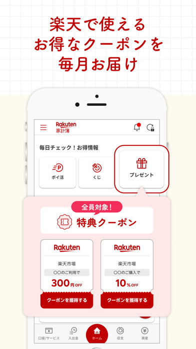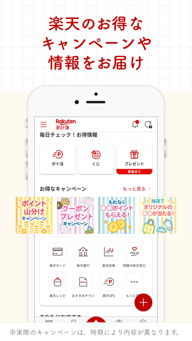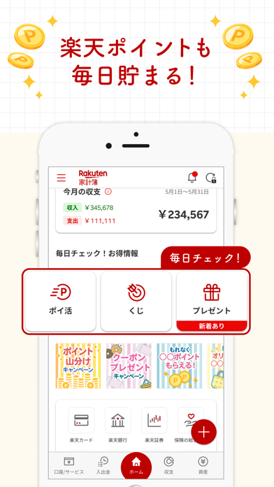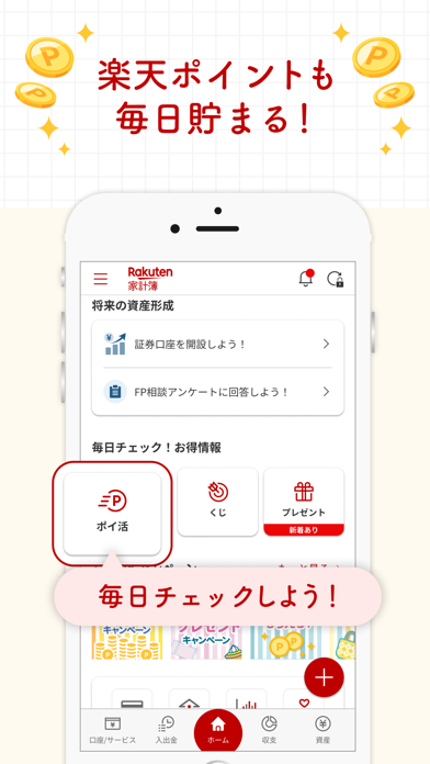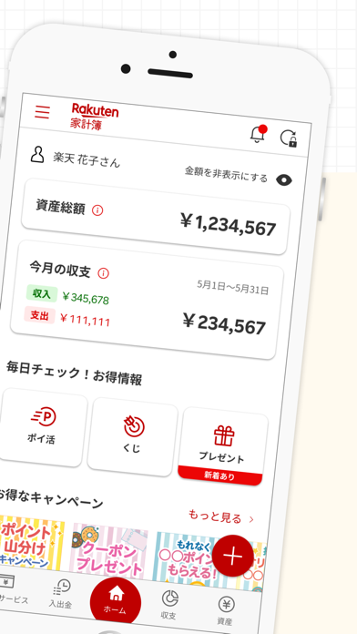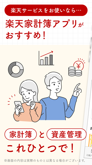 楽天の金融サービスと連携し、お金の動きを自動で記録・管理できる家計簿アプリです。