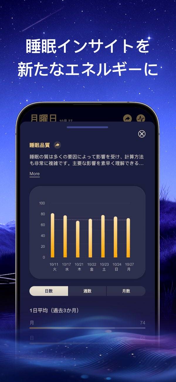 - 睡眠の質をスコアで表示。いびきや無呼吸状態の発生時刻も教えてくれる