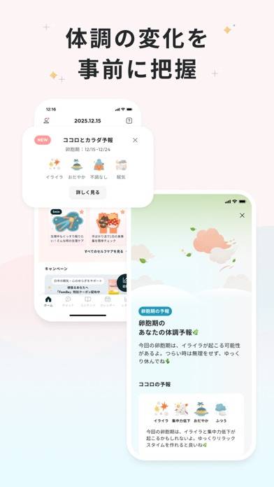 生理日と排卵日をカレンダー内でひと目で確認できるから、予定が立てやすくなります。体調予報では周期に合わせて起こりやすい変化を事前に知らせてくれるので、大切な予定があるときの対策にも。体のリズムをちょっと意識して、無理しすぎない毎日が実現できます。