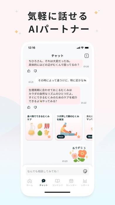 生理日を記録するだけで、ホルモンの影響による心と体のゆらぎをグラフで確認できます。気になる症状はAIチャットに相談すれば、自分に合ったケア方法を提案してくれるのも魅力。先の予定を立てやすくなり、自分らしく過ごす手助けになります。