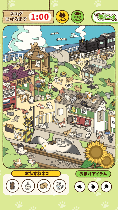 60秒以内に4匹のねこをさがしましょう。ねこがいっぱいで幸せ……もとい探すのは大変ですが、拡大を上手く使ってねこを見つけてあげてください。一度ステージをクリアすれば、時間無限モードでステージをじっくり眺められますよ。