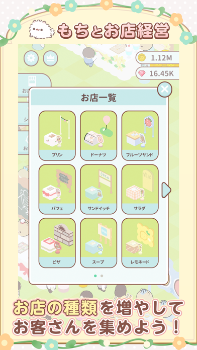 もちと一緒にマルシェを経営し、より大きな市場に拡大していきましょう。もちを操作してお皿を運べるほか、売上金を使って施設を建設したり、席を増やしたり、一緒に働く仲間を増やしたりしていきます。また、もちのコミカルな動きがとにかくかわいいです。