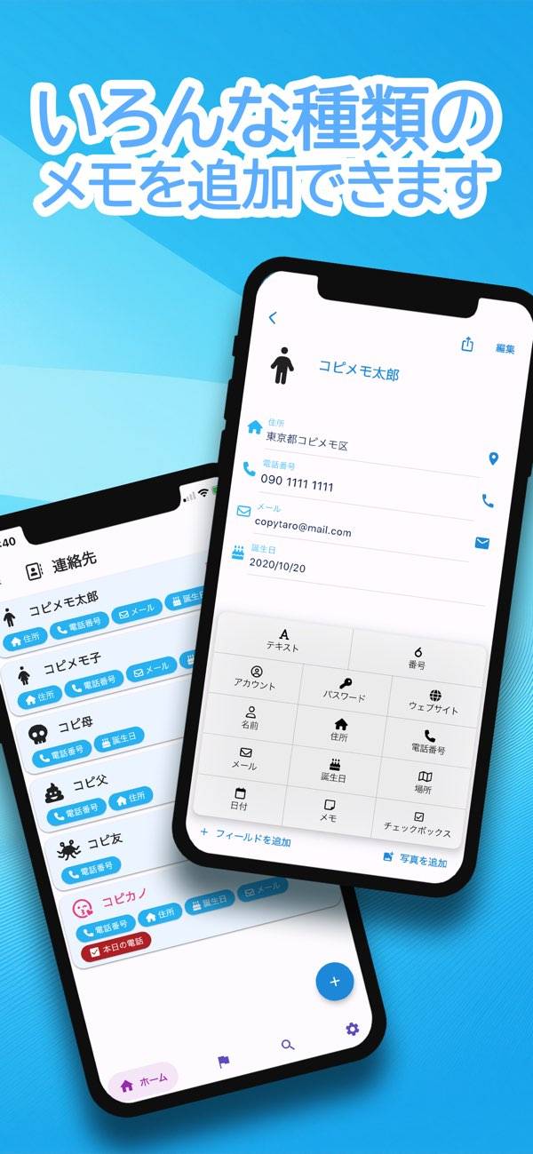 アプリ内に記載しておいたフィールド(メモ)をタップするだけでコピーが完了します。住所や電話番号は直接表示されていないため、見た目にもスッキリ。