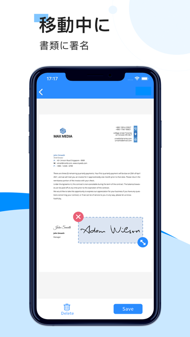 簡単な編集機能も備わっています。注釈を付けて補足情報の追加が可能。また、もし紙の文書内に署名欄があれば、本アプリ内で手書き入力が可能。