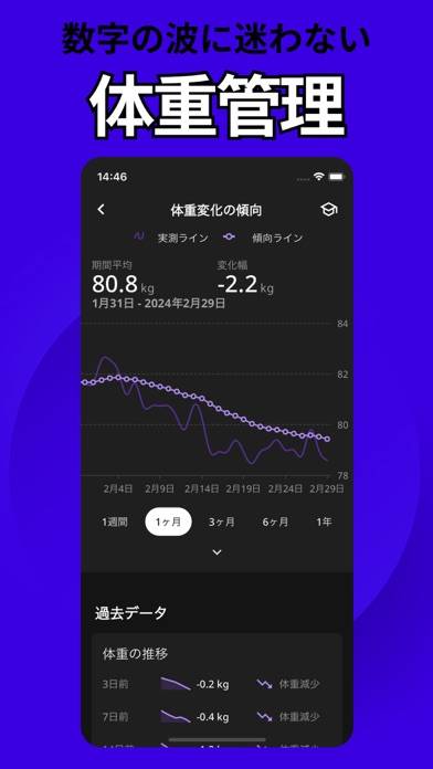 今まで記録を分析してこれからの予測をグラフで表示してくれます。今までの努力がどうなっていくのかわかるので、現在の取り組みを変える・継続するといった判断材料になるでしょう。実際に効果がある予測になっていればモチベーションも向上しますね。
