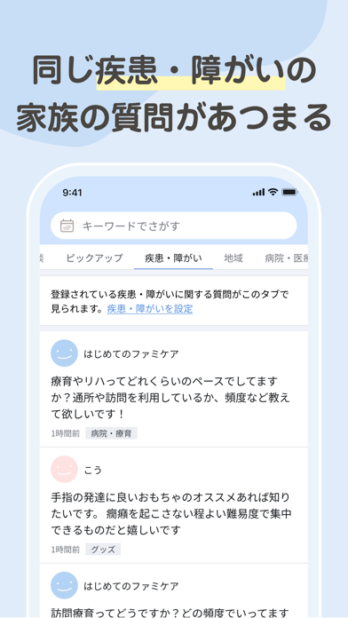 疾患児・障がい児家族のための相談Q&Aアプリです。同じ立場の人たちが本アプリ内に集まり、悩みを打ち明けたり、情報を共有しあったりしながら、いっしょに寄り添ってくれる感覚を味わえます。