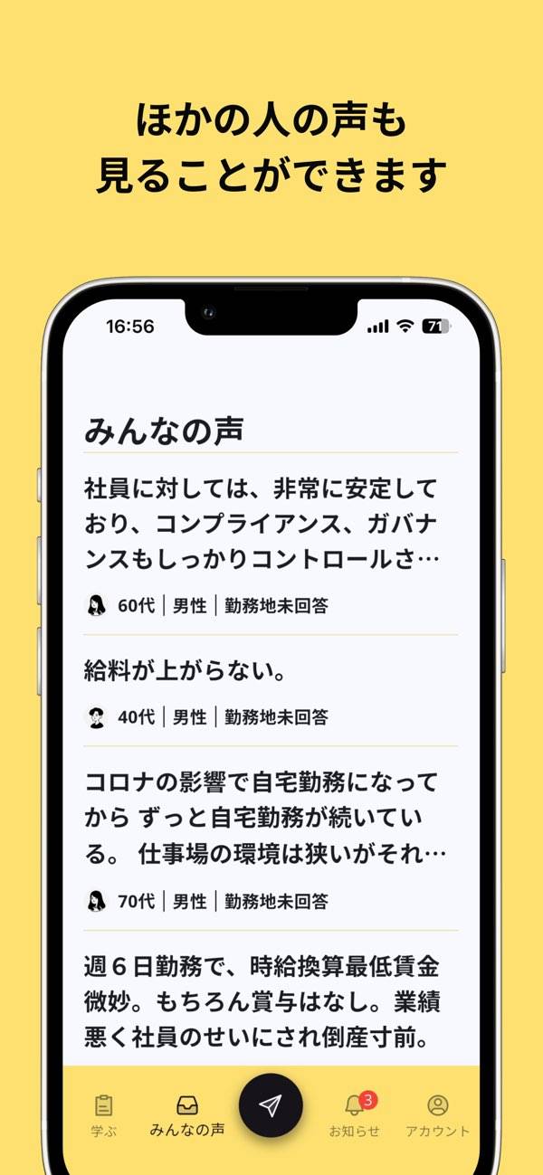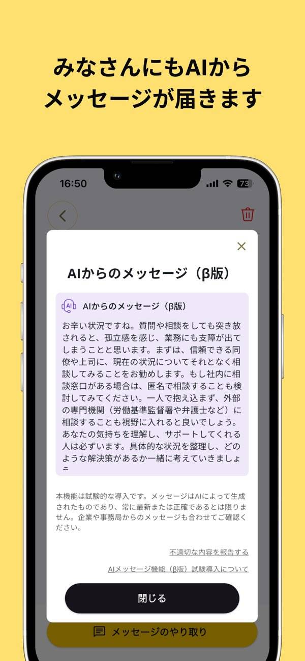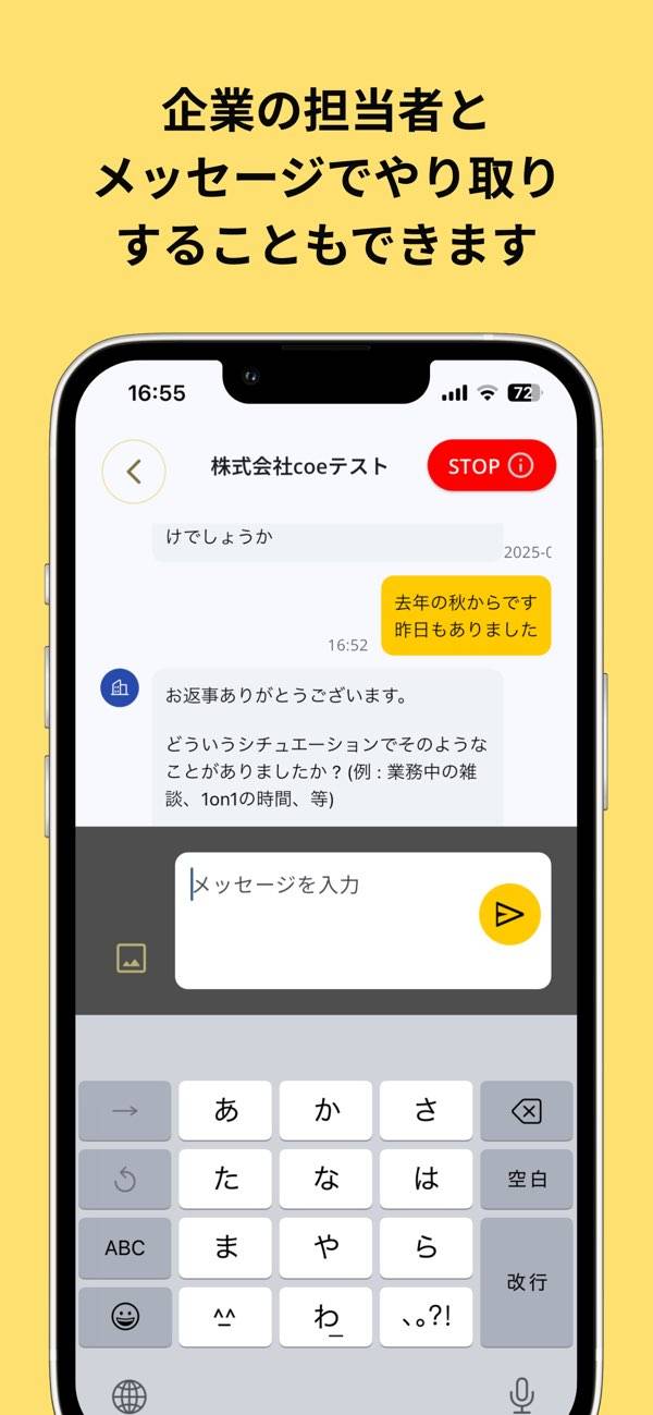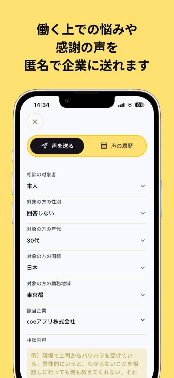 ただ本アプリから企業に声が届くまでは時間がかかります。本当に緊急の場合は、然るべき専門機関へ相談を。