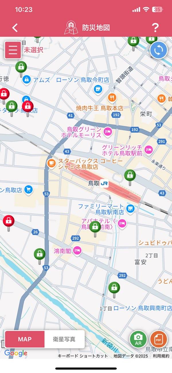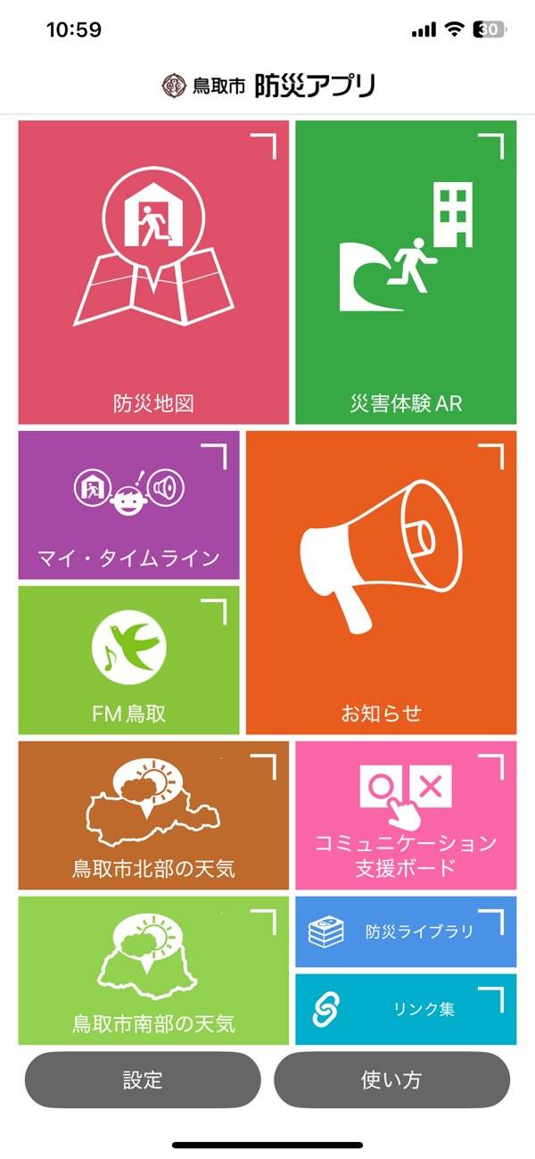 鳥取市が直接提供する総合防災アプリです。防災地図など必要な機能は一通り網羅されており、アプリから「FM鳥取~RADIO BIRD~」の再生も可能。河川氾濫による浸水のシミュレーションができる災害体験ARもあり、否が応でも危機感を養うといった使い方も。