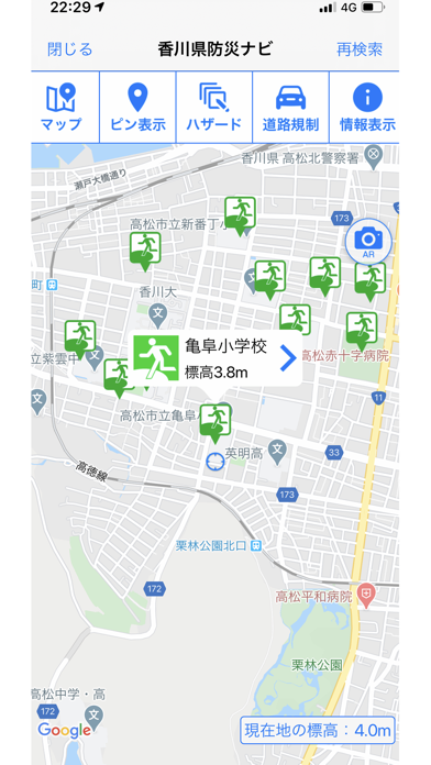 現在地付近の避難場所を表示。AR機能を使うことでコンパスが表示され、目的地の方向がより分かりやすくなります。目的地までの方角が表示されていれば、多少パニックになっていても進む方向を間違える心配が減り、迅速な非難が可能になります。