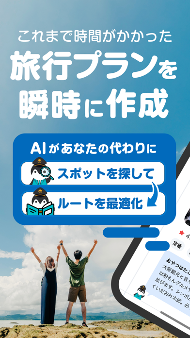AIが旅行プランを簡単に作成するアプリです。旅行したい場所や条件を入力するだけで、観光スポットやホテル、レストランを最適化したプランを瞬時に提案してくれます。行きたい場所はあるけど旅行計画が苦手な方や効率的に観光したい方におすすめです。