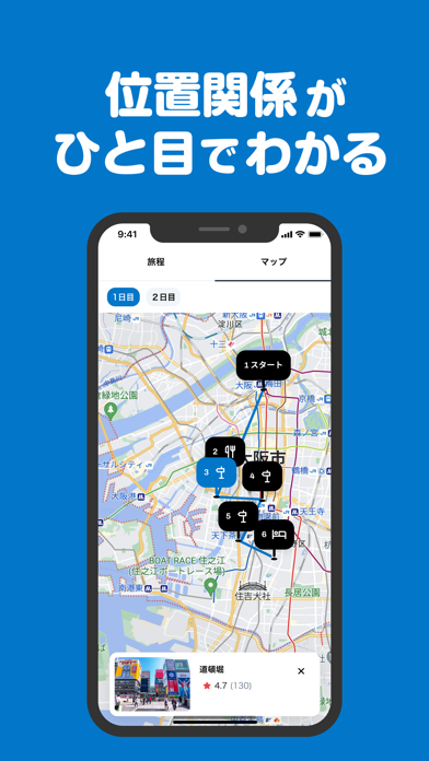 マップ上で観光スポットやルートの位置関係を確認できます。これにより、どのスポットがどこにあるのかを直感的に理解し、効率的な移動しやすいです。スポットの変更もできるので、行きたい場所がない時は変更してみてください。