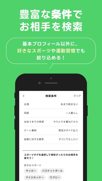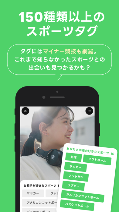 スポーツ好き同士で出会える機能が豊富。自分の好きなスポーツを選択できるタグや、特に好きなスポーツや応援チームについて、写真付きでアピールできる「スポーツベスト」機能などを搭載。スポーツ好き同士だから、話もあって良い関係が築きやすいです。