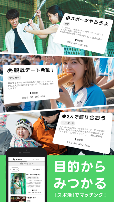 スポ活機能を利用して、スポーツデートを叶えられます。一緒にスポーツ観戦に行きたい、スポーツがしたいといった具体的な内容に加え、日程や場所を決めてアプリ内で募集可能。募集形式のため、初デートの内容に悩む人でも利用しやすいです。