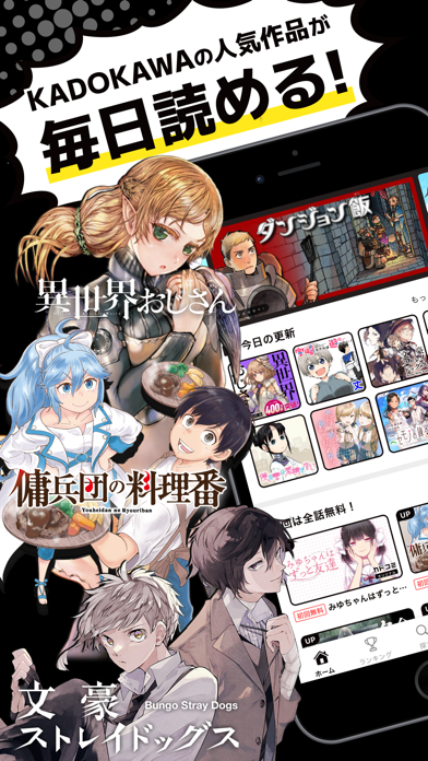 KADOKAWAのオリジナル作品が多数揃っているマンガアプリです。初回限定で全話無料の作品もあり、すぐに人気の連載に追いつくことができます。通勤中や寝る前など、空いた時間に気軽に楽しめるので、マンガ好きには特におすすめ。